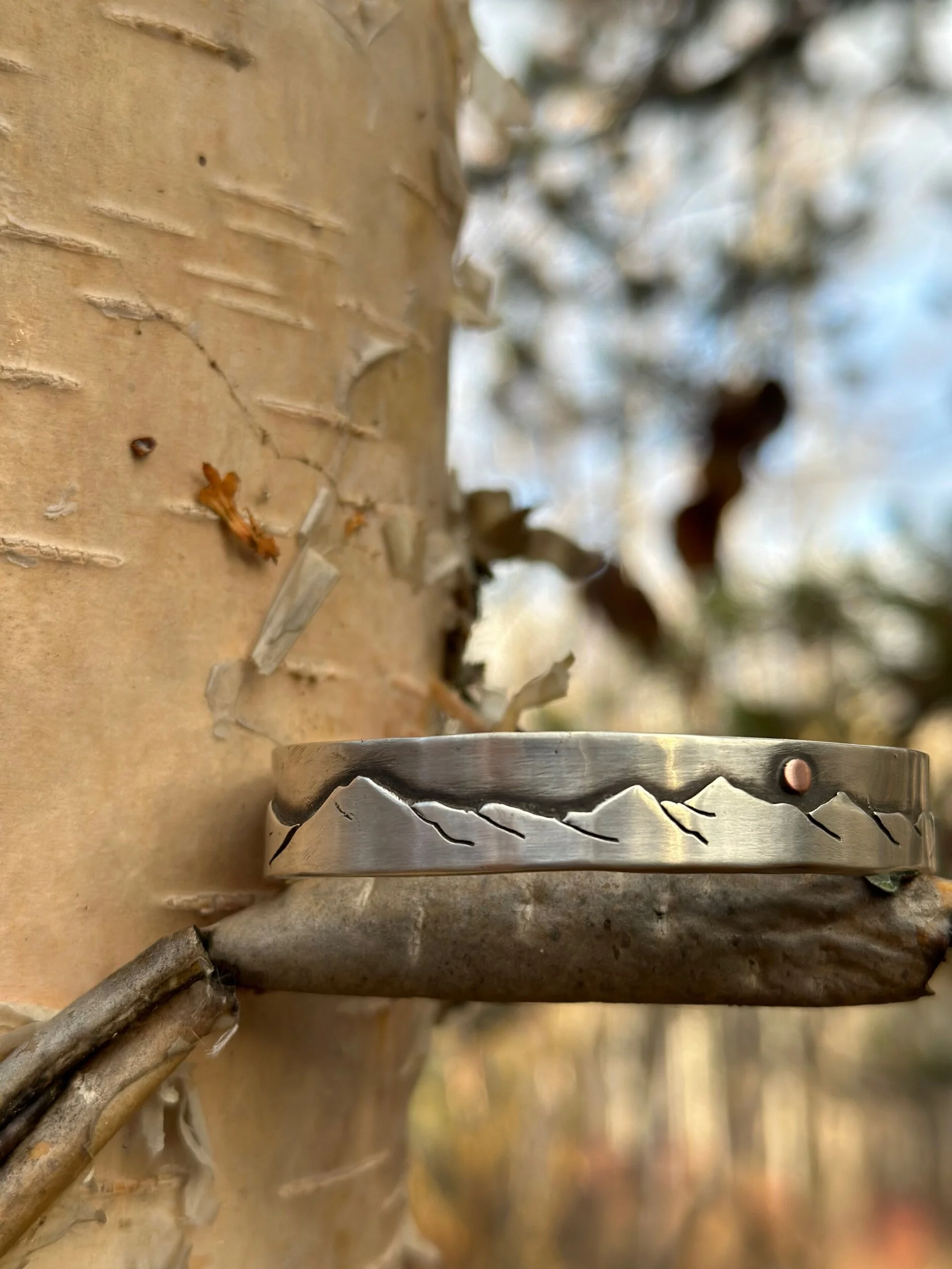Image 1 of 5 Image 2 of 5 Image 3 of 5 Image 4 of 5 Image 5 of 5 Mountain Sunrise Cuff CA$150.00 sold out .925 Sterling Silver CuffSize - Medium Featuring hand cut mountain overlay and copper sun. Sold Out Added! .925 Sterling Silver CuffSize - Medium Featuring hand cut mountain overlay and copper sun.