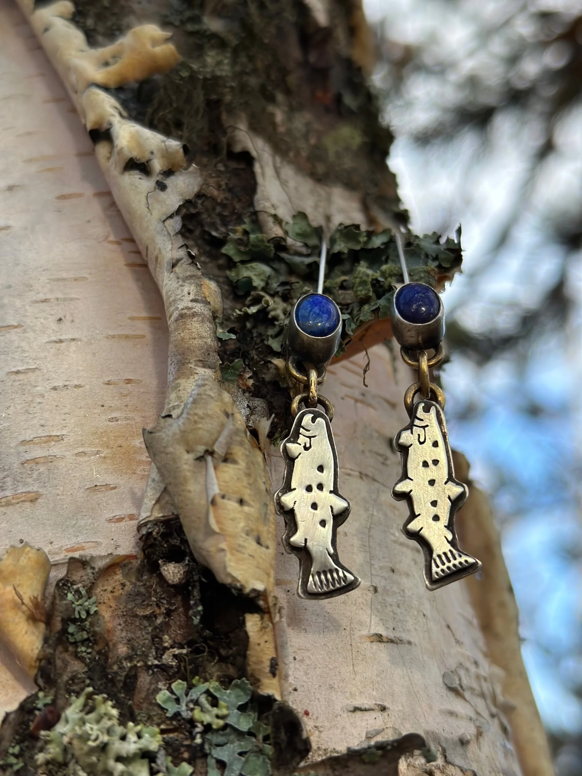 Image 1 of 3 Image 2 of 3 Image 3 of 3 Steelhead Danglers CA$120.00 sold out Made from 100% recycled .925 Sterling Silver.Featuring:Hand cut Steelhead Trout overlay, Lapis stones and brass chain. Sold Out Added! Made from 100% recycled .925 Sterling Silver.Featuring:Hand cut Steelhead Trout overlay, Lapis stones and brass chain.