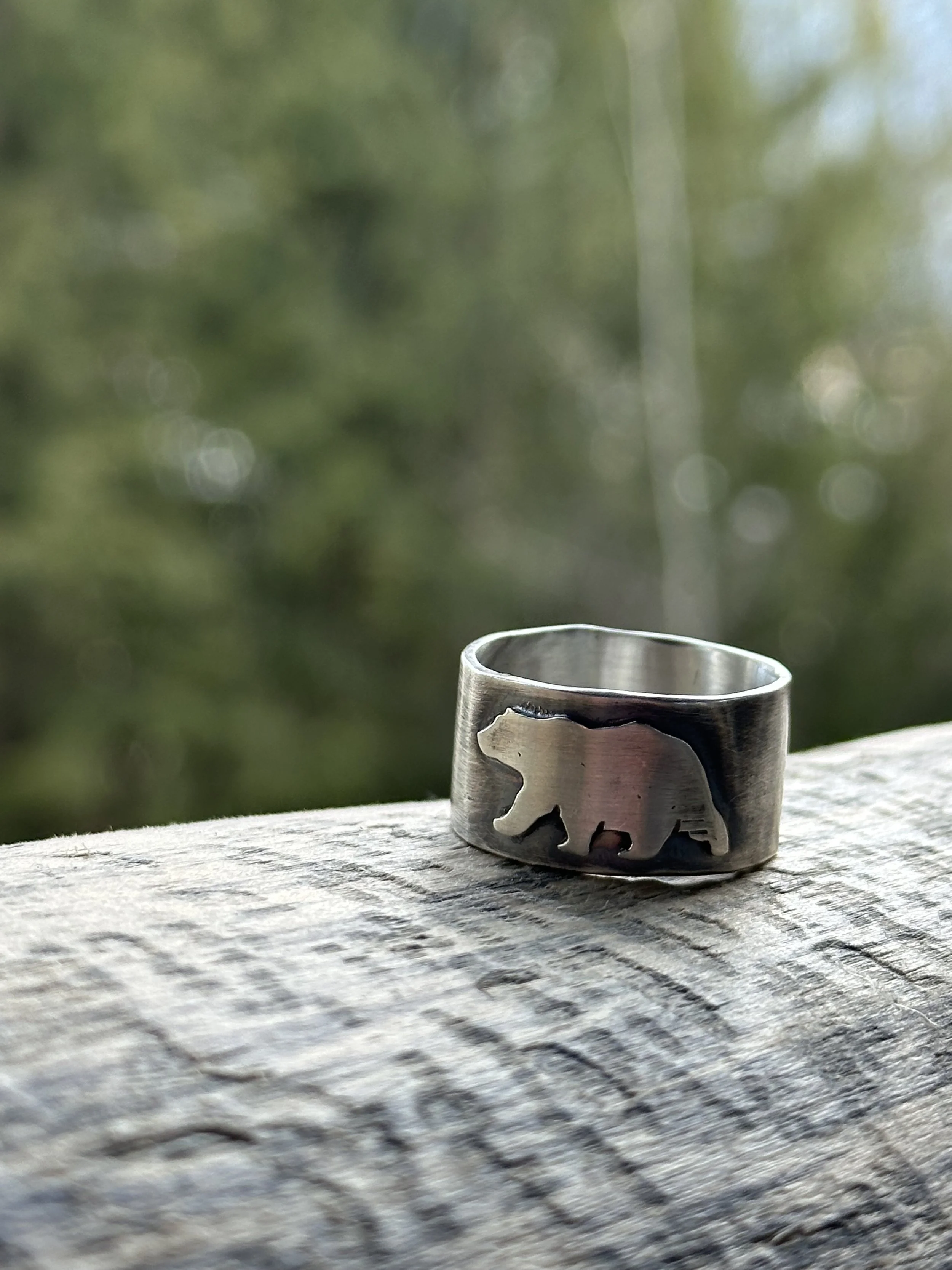Hand forged from. 925 reclaimed sterling silver. Featuring a hand sawed Grizzly Bear overlay and darkened with an oxidizing patina.